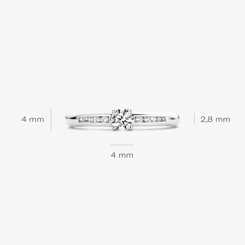 Deze klassieke 14k witgouden ring heeft een grote zirkonia van 4 mm doorsnede in het midden en kleine zirkonia’s in de band. De band is 2,8 mm breed. De ring kan mooi gematcht worden met andere ringen uit onze collectie.