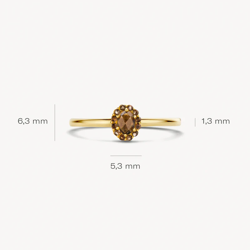 Deze ring van 14k geelgoud met smokey kwarts heeft de wauw-factor door de grotere steen in het midden die wordt omzoomd door kleinere exemplaren. De band van de ring heeft een doorsnede van 1,3 mm. Prachtig op zichzelf maar ook mooi met andere ringen uit onze collectie.