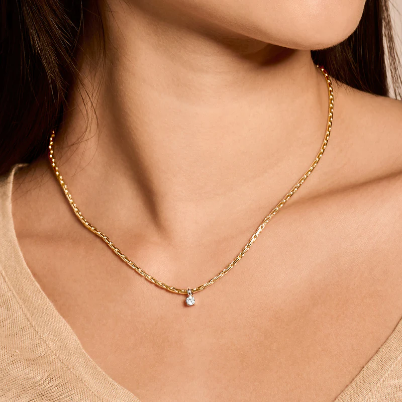 Deze elegante halsketting heeft fantasieschakels in 14k wit- en geelgoud en een sprankelende hanger met zirkonia. Het heeft een lengte van 42 cm en de hanger een doorsnede van 2,4 mm. Heel mooi op zichzelf maar ook goed te combineren met andere sieraden uit onze collectie.