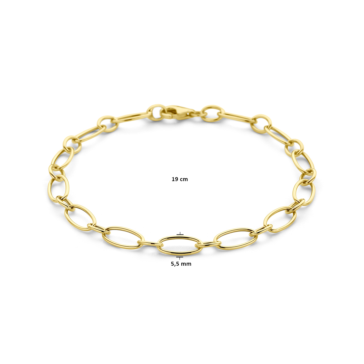 Geelgouden armband uitgevoerd met een karabijn sluiting. Deze armband heeft een draaglengte van 19cm. De schakelbreedtes zijn 4.7mm en 5.5mm.