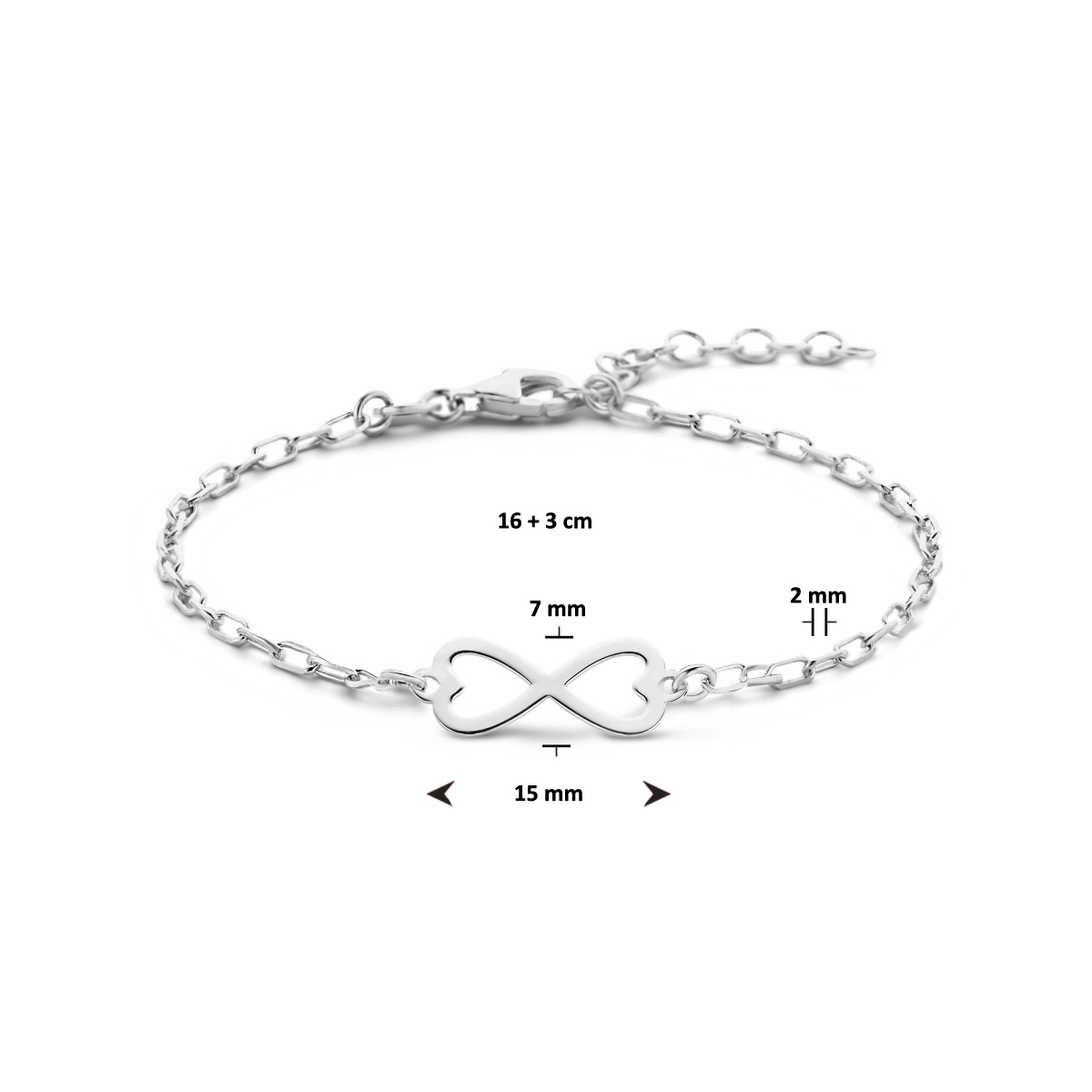 Gerhodineerd 925 zilveren armband met een infinity voorstelling en een karabijn sluiting. De armband heeft een draaglengte van 16cm en een extensie van 3cm. De schakelbreedte is 2mm.