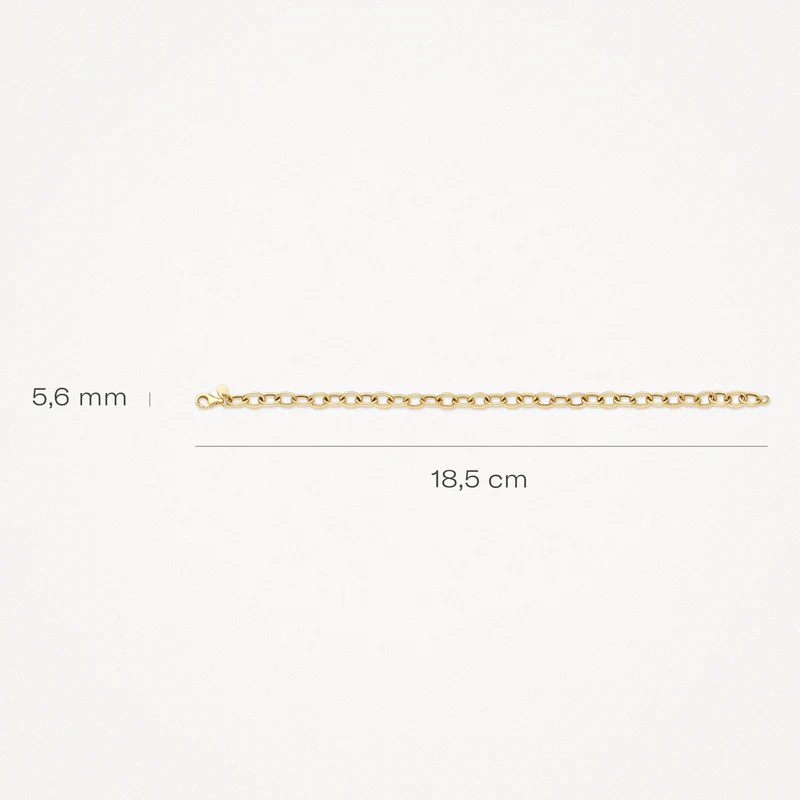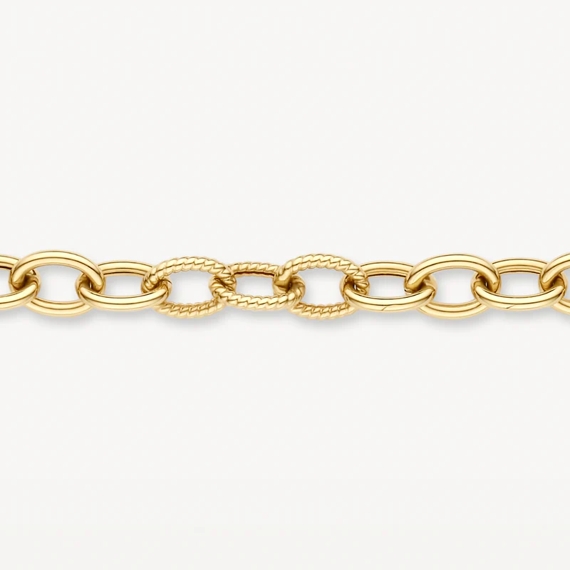 De BLUSH Gouden armband, is een elegante armband met gladde en torsdraad schakels, ideaal voor een polsomtrek van 18,5 cm. Deze jasseron-armband heeft een verfijnde uitstraling. Draag hem solo voor een subtiele look of combineer met andere sieraden voor een luxe effect. Perfect voor elke gelegenheid.