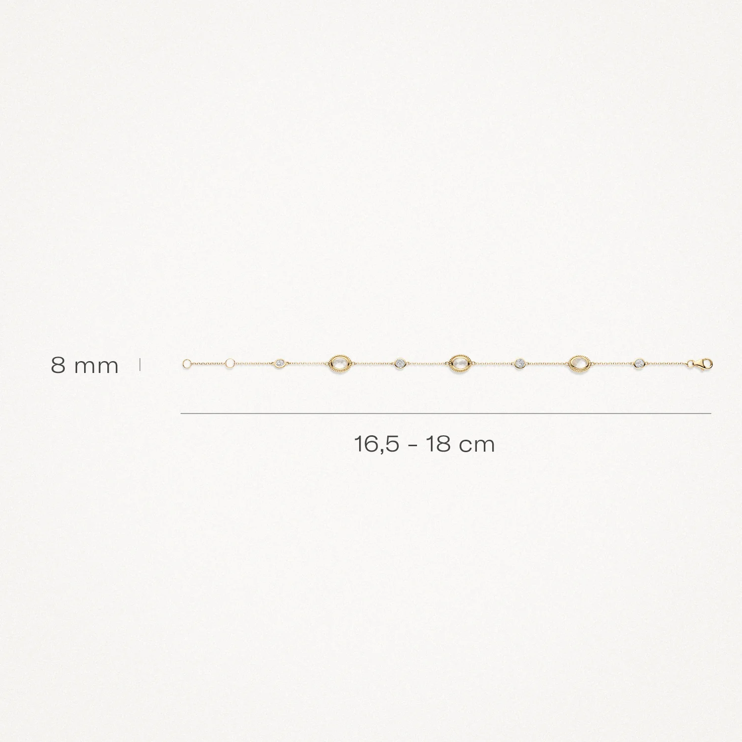 Doublette van parelmoer, zirkonia én bergkristal: deze 14k geelgouden armband met ankerschakels valt op door het fantasierijke ontwerp. Hij heeft een lengte van maximaal 18 cm en is een statement op zich, maar ook heel mooi te combineren met andere sieraden uit onze collectie.