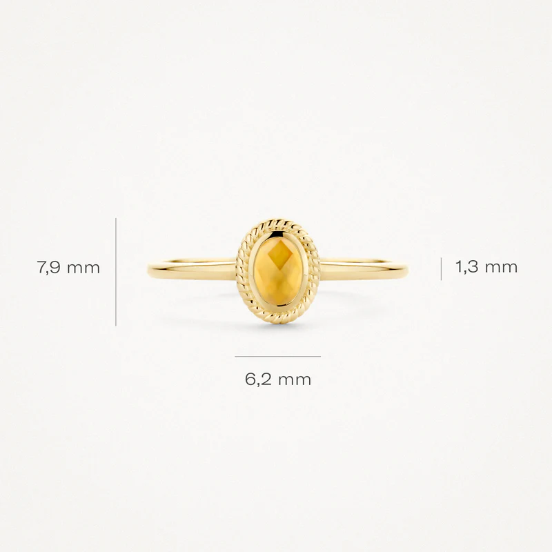 Deze 14k geelgouden ring met citrien en parelmoer heeft een moderne zetting met een kabelmotief. De doorsnede van de band is 1.3 mm en de steen is 6.2 mm bij 7.9 mm. Prachtig op zichzelf maar ook mooi te combineren met andere ringen uit onze collectie.