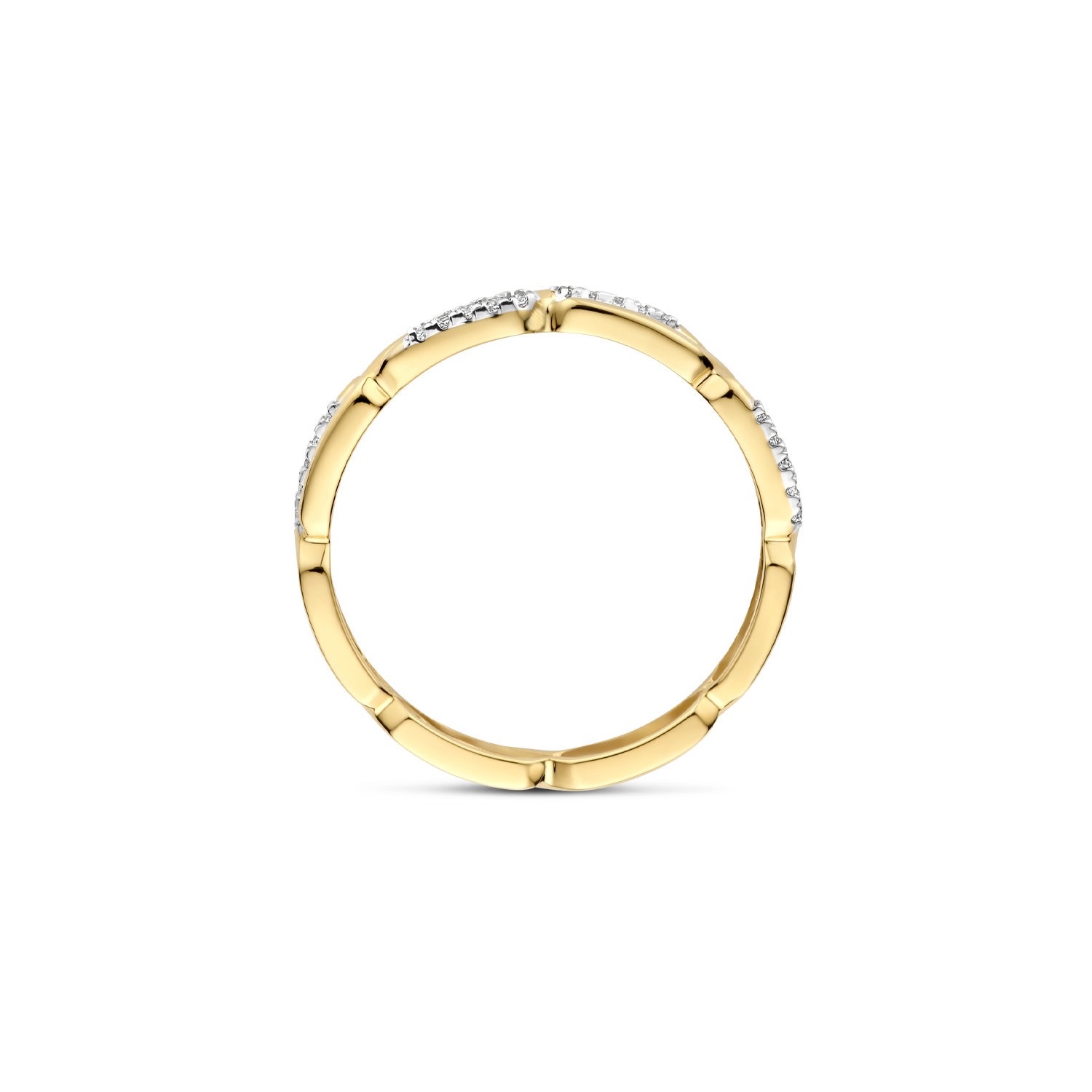 Deze ring van 14k geel- en witgoud bezet met sprankelende zirkonia heeft een origineel, speels ontwerp. De doorsnede van de band is 2,6 mm. Combineer deze fraaie ring met andere (aanschuif)ringen uit onze collectie of draag hem alleen.