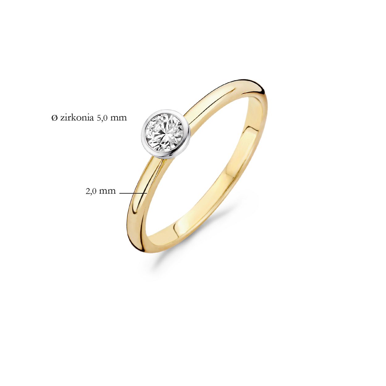 Deze Blush ring met referentie 1124BZI bestaat uit een briljant geslepen zirconia die gezet is in een gladomzetting op de half rond afgewerkte band. De band, uitgevoerd in 14 karaats geelgoud, is 2 millimeter breed. De steen heeft een diameter van 3,5 millimeter. - Wear your Blush