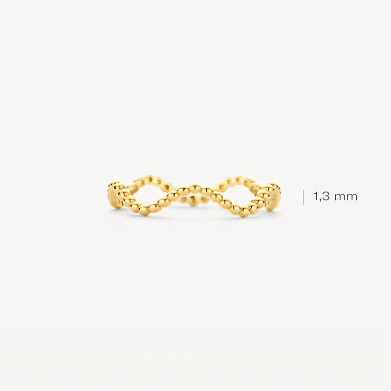 Het golvende ontwerp met bolletjes maakt een echte eyecatcher van deze 14k geelgouden ring. De band heeft een doorsnede van 1,3 mm. De ring is opvallend genoeg om alleen te dragen maar ook heel mooi te matchen met andere (aanschuif)ringen uit onze collectie.