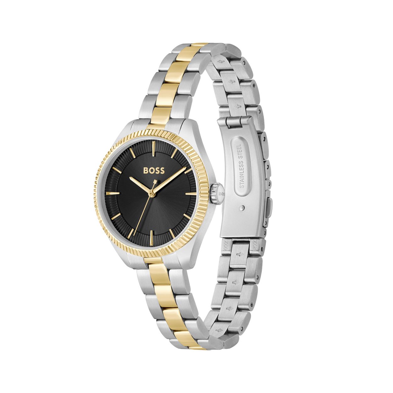 Dit BOSS horloge uit de SAGE serie met artikelnr: HB1502730 heeft een luxe sportieve uitstraling. Zeer geschikt voor de moderne stijlvolle vrouw van nu. Het dameshorloge valt op door zijn zilverkleurige stalen horlogekast met een geribbelde goudkleurige bezel en een zwarte sunray wijzerplaat met verdikte rand met daarop de fijne uuraanduiding. Opvallend ook zijn de lumibrite uur en minutenwijzer. Aan de kast zit een glimmende bi-color schakelband met vouwsluiting. De kast van het horloge heeft een doorsnee van 32mm met mineraalglas en is 3ATM.