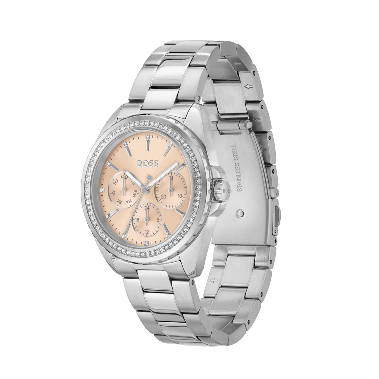 Dit BOSS horloge uit de ATEA serie met artikelnr: HB1502732 heeft een luxe sportieve uitstraling. Zeer geschikt voor de moderne stijlvolle vrouw van nu. Het dameshorloge valt op door zijn zilverkleurige stalen horlogekast met een gekartelde zilverkleurige bezel en een rozekleurige sunray wijzerplaat met een streepje en een kristal als uursaanduiding. Opvallend ook zijn de rondjes met dag,- datum,- en 24-uursaanduiding met fijne wijzers, en de lumibrite uur en minutenwijzer. Aan de kast zit een mat glimmende zilverkleurige schakelband met vouwsluiting. De kast van het horloge heeft een doorsnee van 38mm met mineraalglas en is 3ATM.