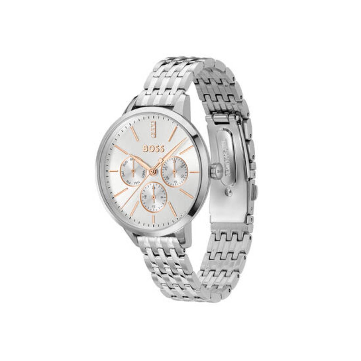 Een stalen horloge van het merk BOSS by Hugo Boss. Het horloge heeft een stalen band en subtiele gedoubleerde elementen op de zilverkleurige wijzerplaat en 4 zirconia's op de 12 index.
