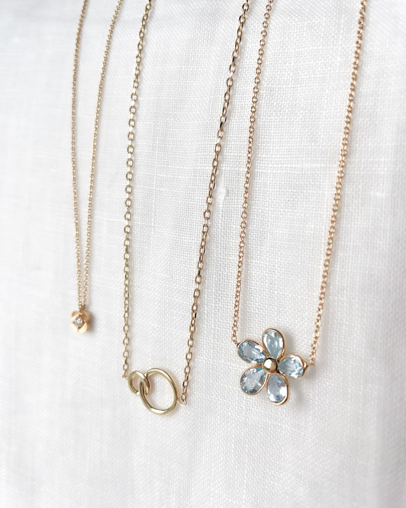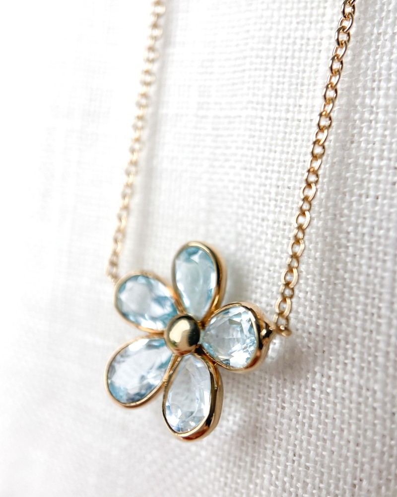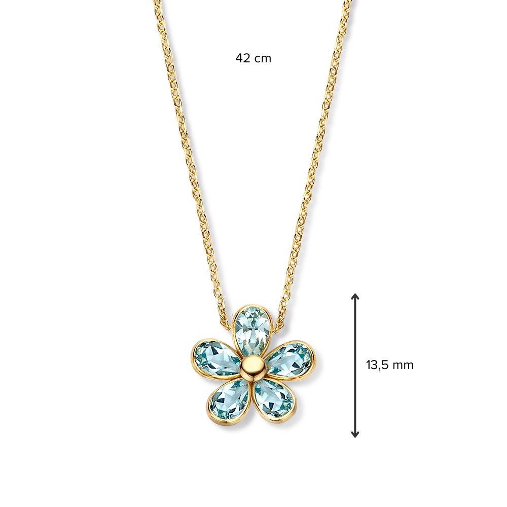 Geelgouden collier met speelse bloemhanger gezet met blauwe topaas.