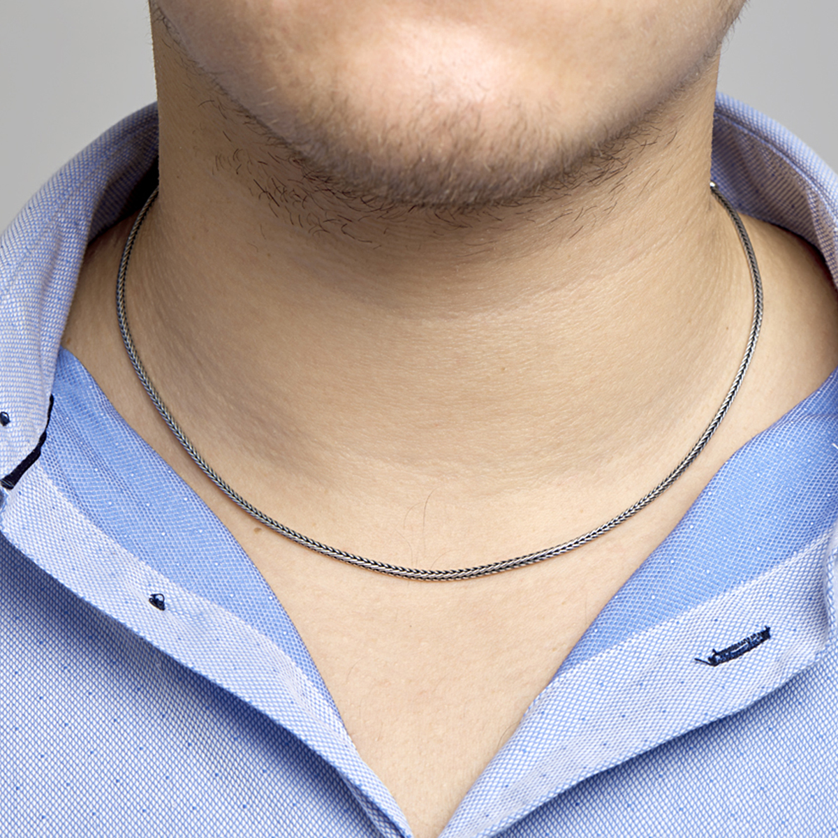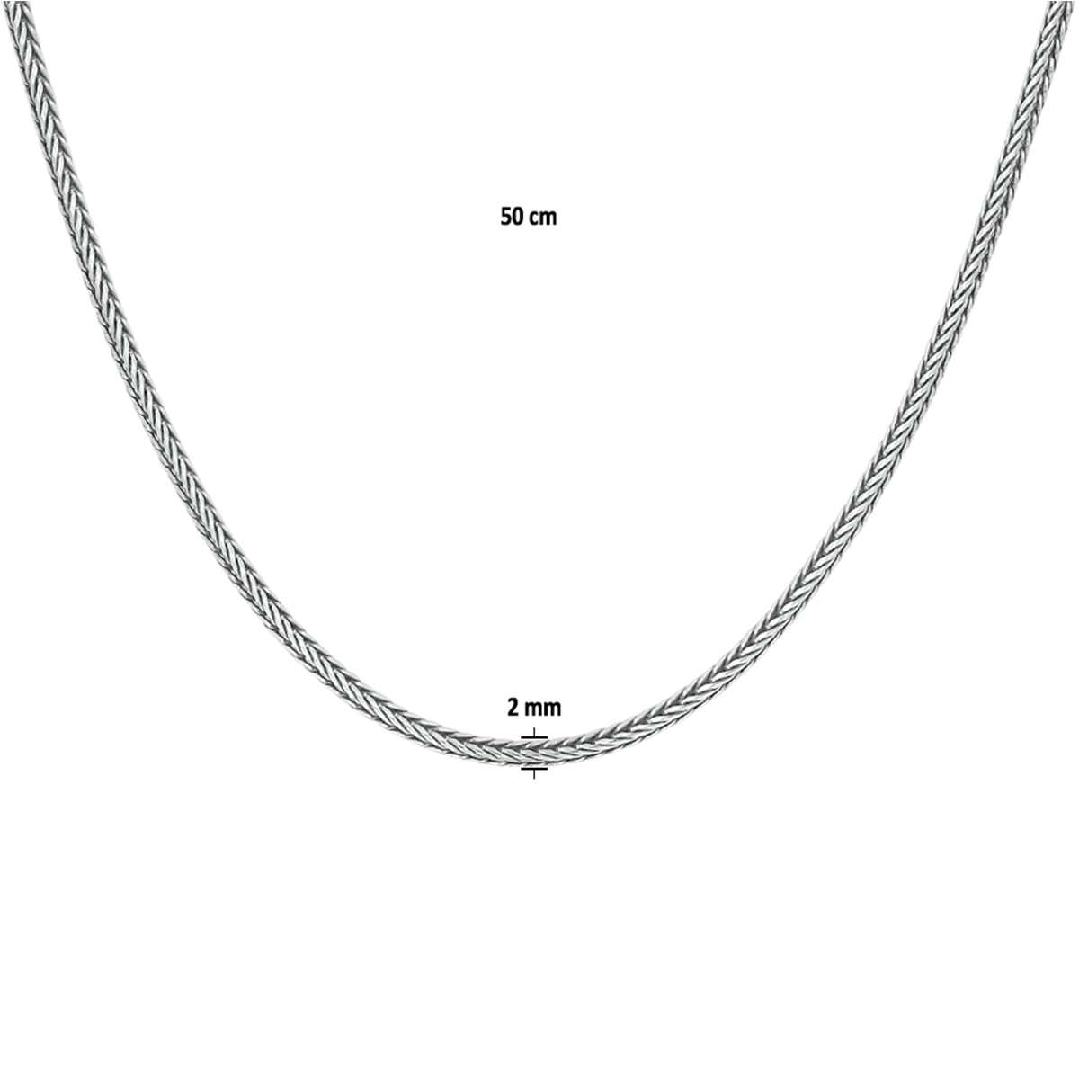 Geoxideerd zilveren collier met een vossestaart schakel en een stevige karabijn sluiting. Het collier heeft een draaglengte van 50cm. De schakelbreedte is 2.0mm.