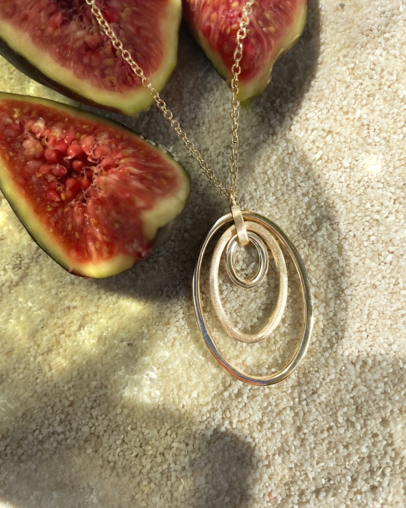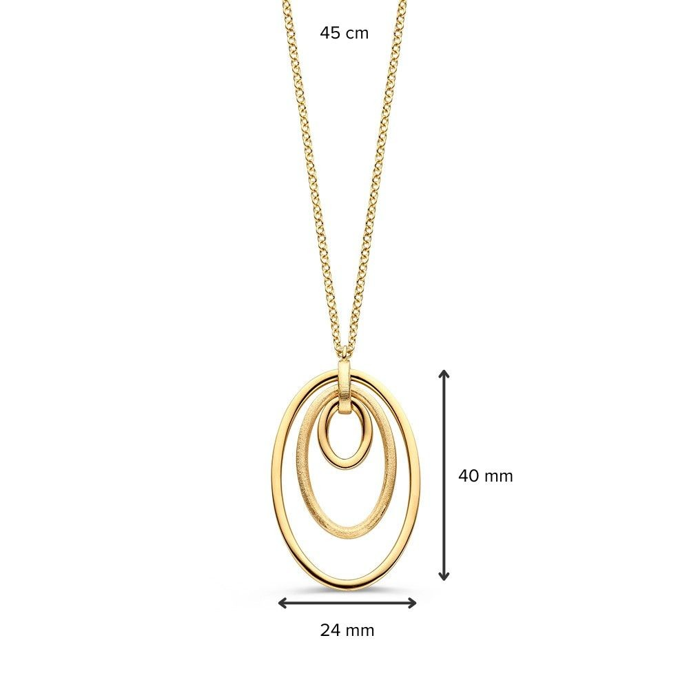 Geelgouden collier met opvallende hanger van drie ovale elementen die in elkaar vallen. Het middelste element is gematteerd afgewerkt.