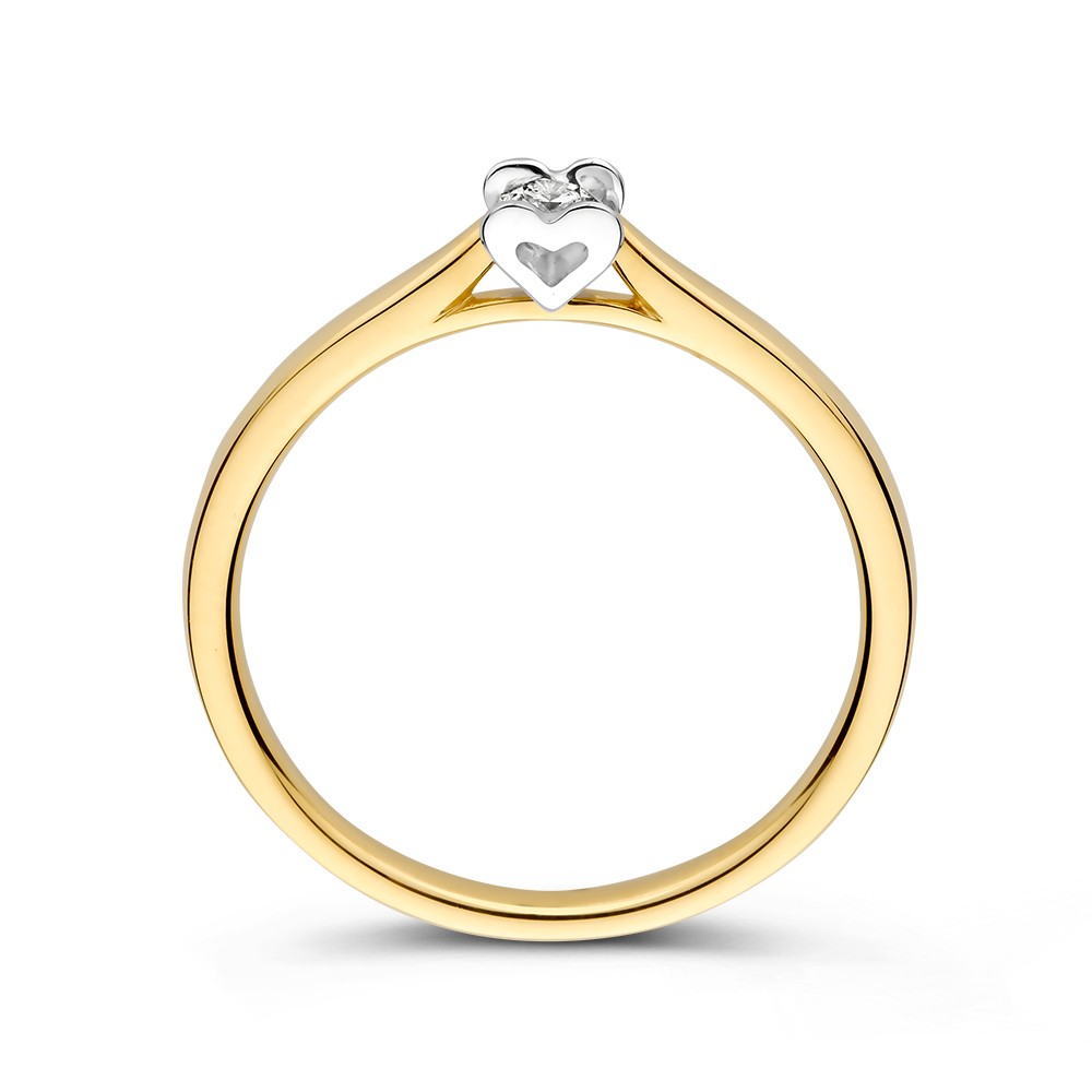 Bicolor wit- en geelgouden solitair ring met een diamant een bijzondere hartvormige zetting.