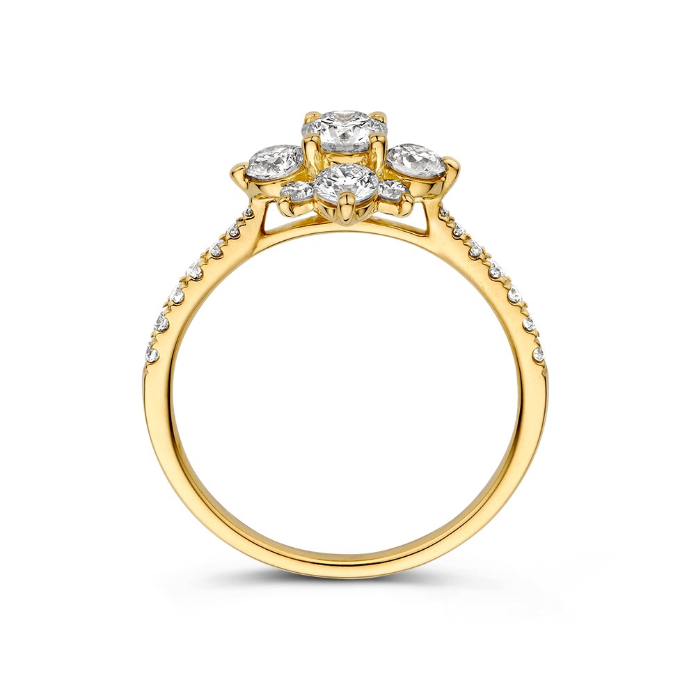 Spraakmakende, geelgouden ring met diamanten in een klassieke entourage zetting. De ring bevat een middensteen van 0,32 crt. welke wordt omringd door meer briljant geslepen diamanten. Ook in de band van de ring zijn fijne diamanten gezet. Een schitterend plaatje aan de hand!