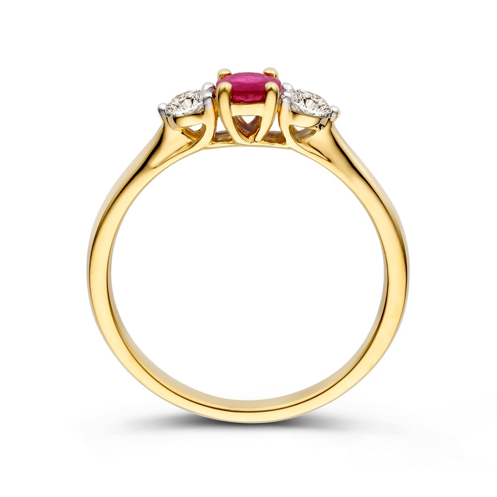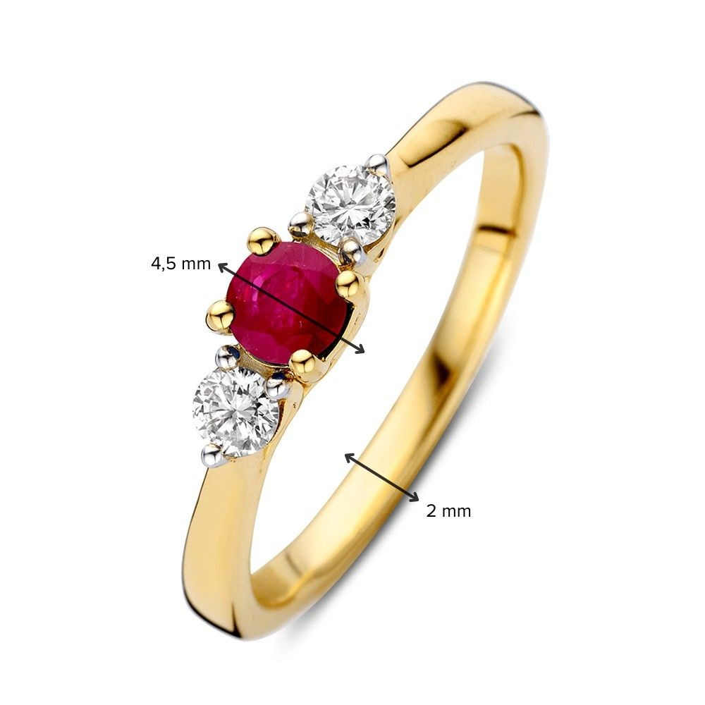 Elegante, 14kt geelgouden ring met een prachtige robijn als middensteen. De rode edelsteen wordt aan beide kanten vergezeld door twee briljant geslepen diamanten voor extra sparkle.