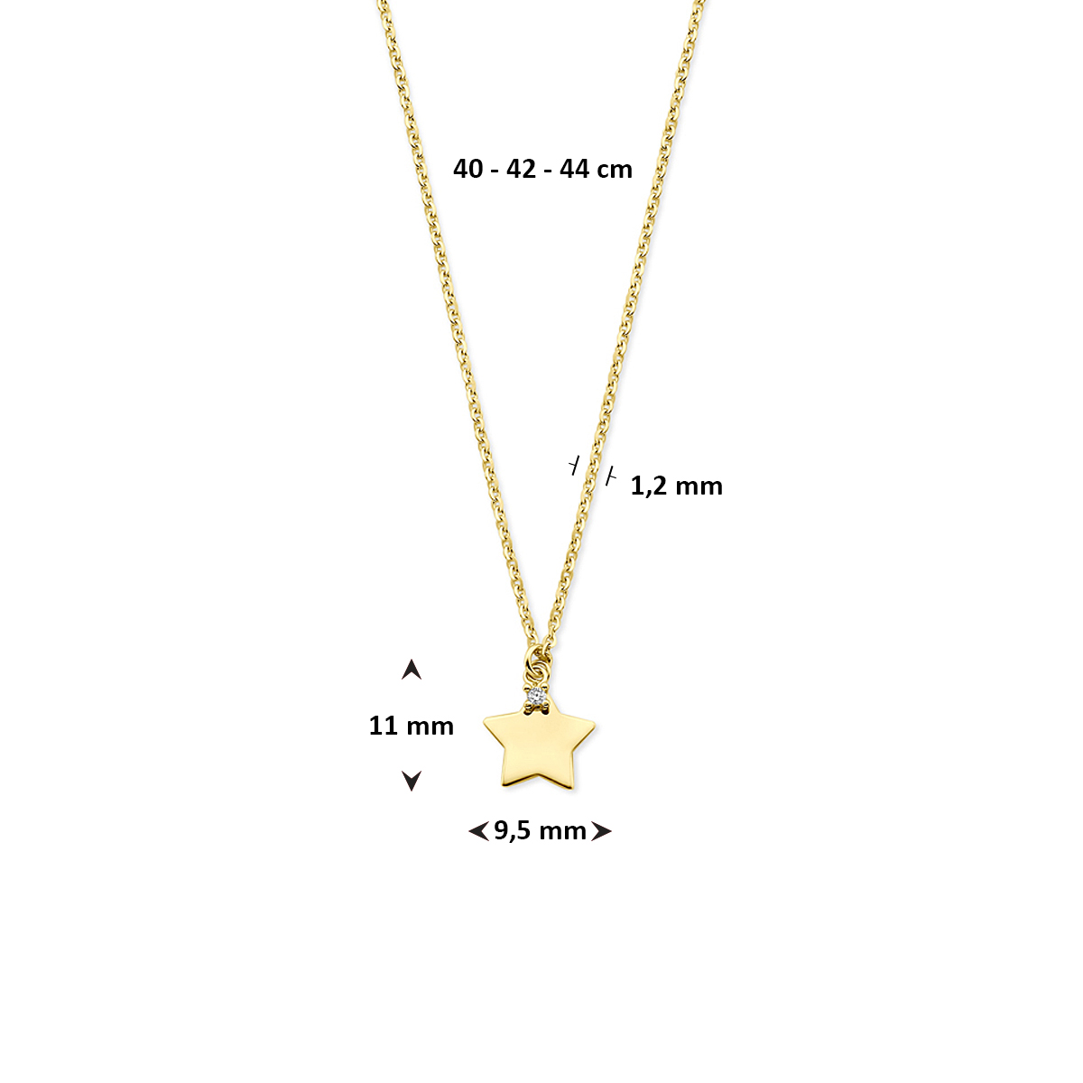 14k Geelgouden collier uitgevoerd met een ster en zirkonia. Het collier heeft draaglengtes van 40-42-44cm.