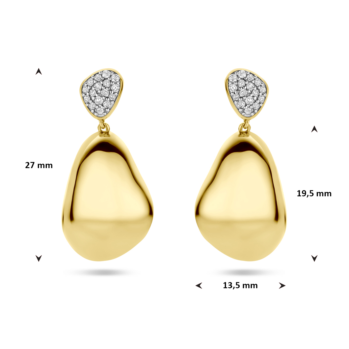 14k Geelgouden oorhangers uitgevoerd met diamant. De oorhangers hebben een totale hoogte van 27mm en het totale diamantgewicht is 0.20ct.