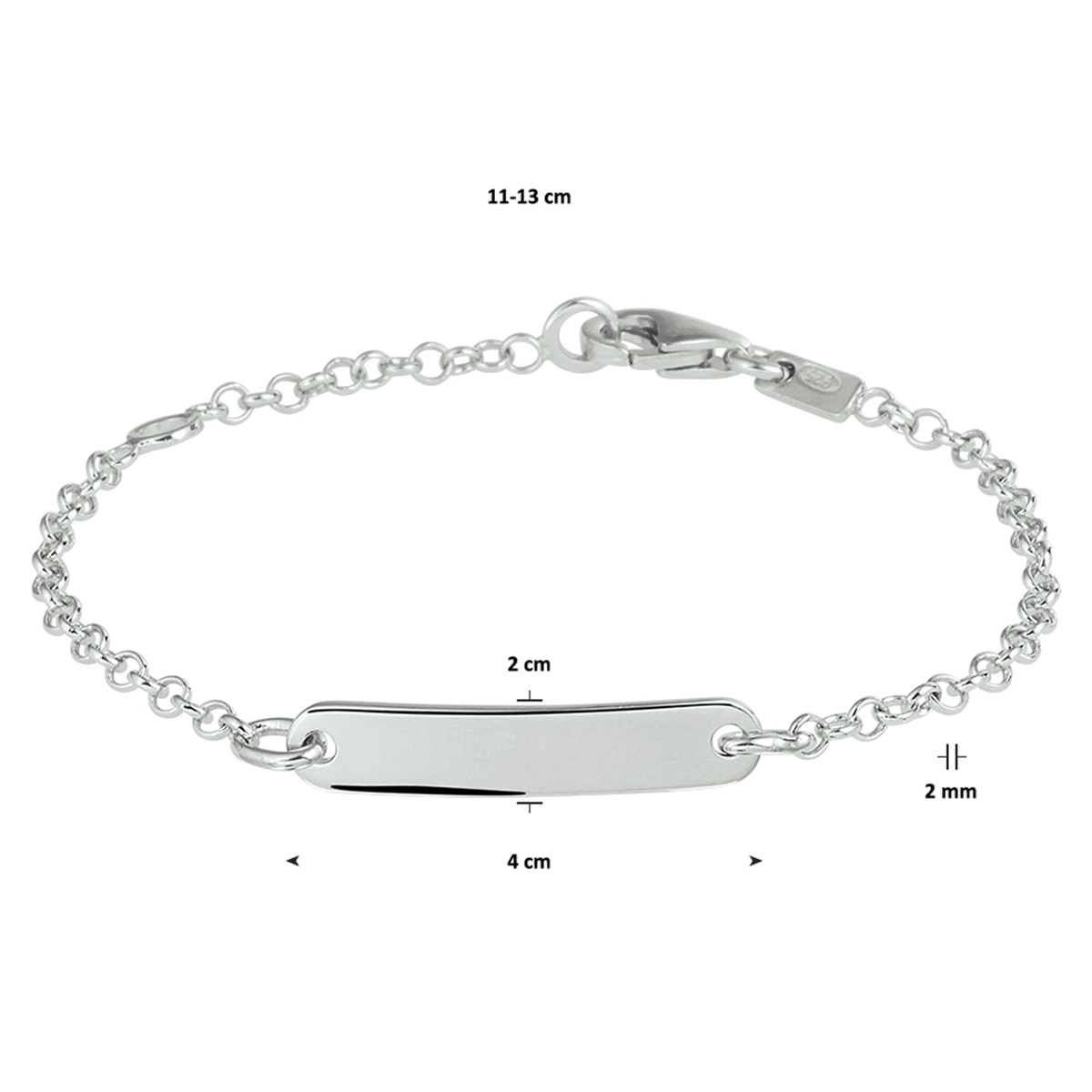Gerhodineerd zilveren kinder graveerarmband uitgevoerd met een plaat van 4x20mm en een karabijn sluiting. De schakelbreedte is 2.0mm. Info: Gerhodineerd zilver is door de rhodiumlaag beter bestand tegen verkleuren en krassen.