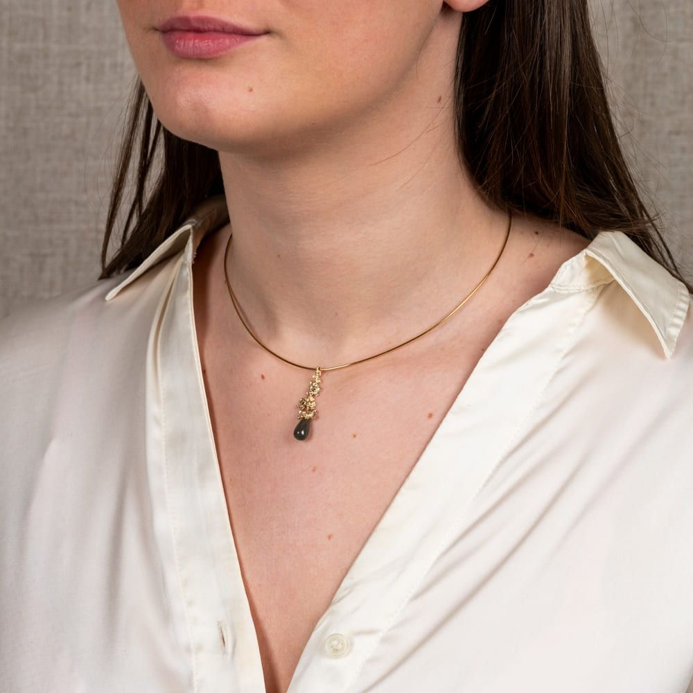 Hanger gemaakt van 14 karaat goud in combinatie met de edelsteen Labradoriet. Deze hanger kan perfect gecombineerd worden met de andere sieraden uit de Blossom-lijn.