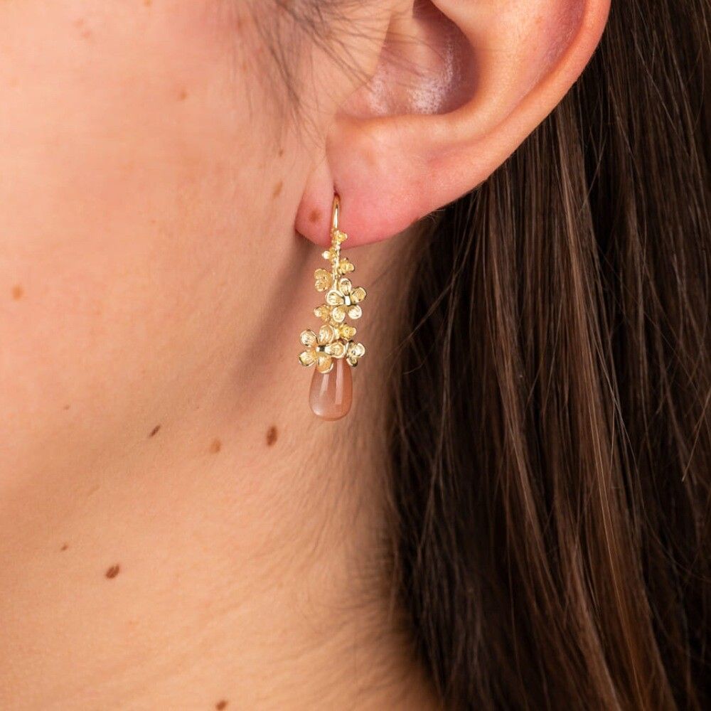Oorhanger gemaakt van 14 karaat goud in combinatie met de edelsteen Oranje Maansteen. Deze oorhanger kan perfect gecombineerd worden met de andere sieraden uit de Blossom-lijn.
