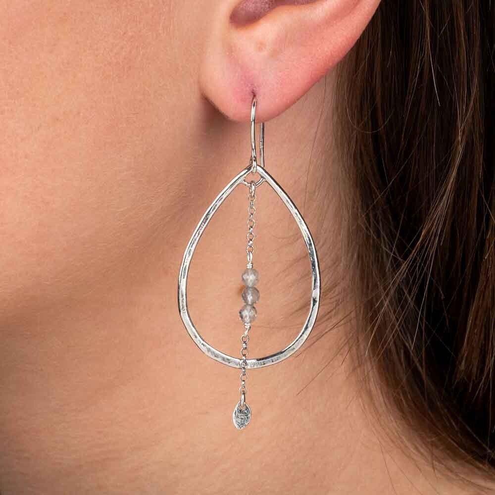 Oorbellen gemaakt van 025 sterling zilver met daaraan een slinger met Labradoriet. De oorbellen zijn asymmetrisch, aan de ene oorbel hangt een slinger met 1 steen en aan de andere 3 stenen. Dit maakt het sieraad uniek en speels! Combineer deze oorbellen met een mooi collier, een ring en armband voor een complete look!