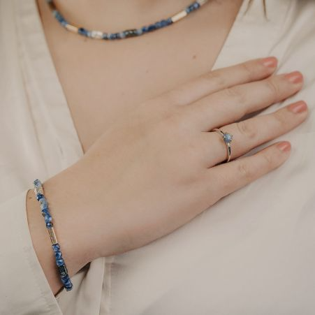 Armband uit de collectie van Jéh Jewels, gemaakt van 925 sterling zilver, geoxideerd zilver, Goldfilled en Kyaniet. Kyaniet is blauw van kleur en "The perfect match" bij al je favoriete spijkerbroeken. Draag haar samen met het bijpassende collier!