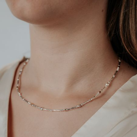 Collier gemaakt van 925 sterling zilver in combinatie met Goldfilled. Tussen de zilveren buisjes vind je bolletjes gemaakt van Goldfilled. Combineer dit collier met de bijpassende armband voor een complete look!