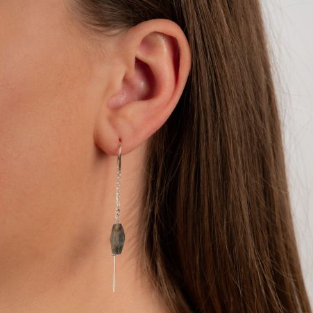 Doortrek oorbel gemaakt van 925 sterling zilver met daaraan de edelsteen Kyaniet. Kyaniet is een spirituele steen met een kalmerende en evenwichtige werking. Combineer deze oorbellen met onze andere sieraden met Kyaniet.