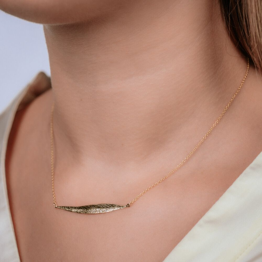 Collier uit de goudcollectie van Jéh Jewels, gemaakt van 14 karaat goud. In het midden van dit fijne collier hangt een elegante bladvormige hanger met daarin een diamant van 0.02 ct.