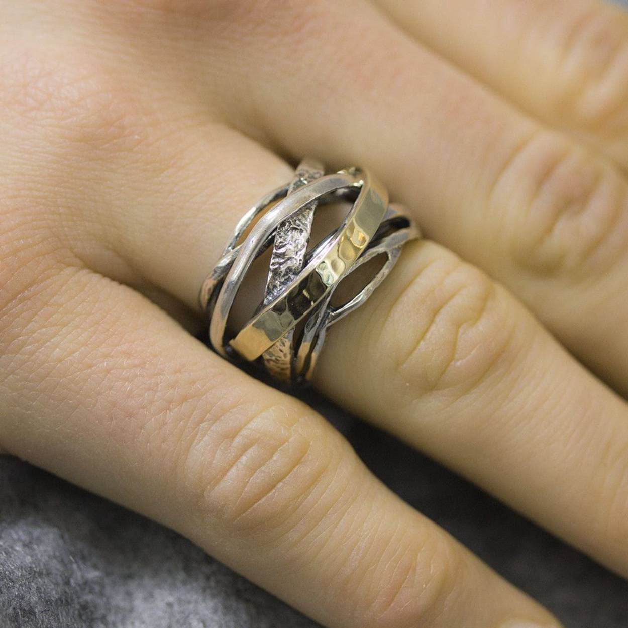 Ring gemaakt van 925 sterling zilver, geoxideerd zilver en 9 karaat. Deze ring is anders dan de gebruikelijke ringen, in plaats van bewegende bandjes heeft deze ring bogen.