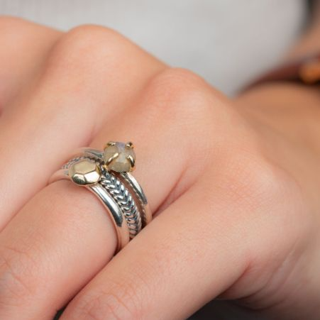 Ring gemaakt van zilver en 9 karaat met een Labradoriet steen. Deze prachtige ring is gemaakt van 925 sterling zilver. Aan de bovenkant zit een Labradoriet steen die wordt vastgehouden door 9 karaat.
