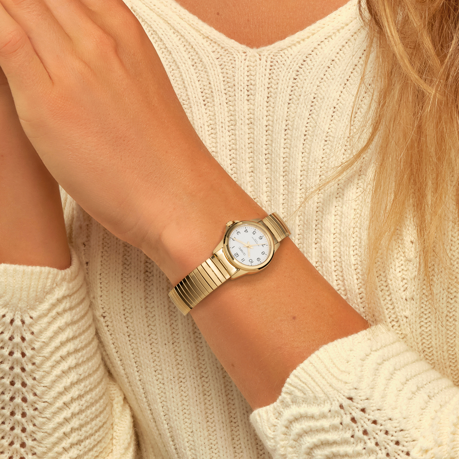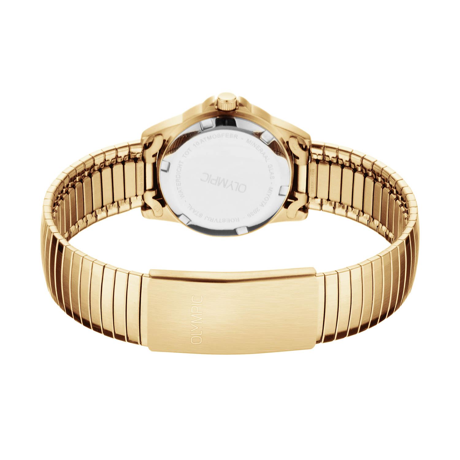 Dit unieke Olympic horloge met artikelnummer: OL26DDD018 is een klassiek dameshorloge. Het horloge heeft een geborstelde matte goudkleurige kast met een witte wijzerplaat met zwarte arabische cijfers en goudkleurige wijzers. Aan het horloge zit een mat/glimmende stalen goudkleurige rekband zonder sluiting. Het horloge heeft een mineraalglas, een afmeting van 27mm en is 10 ATM. Zeer geschikt voor oudere mensen en klanten die moeite hebben met sluitingen.