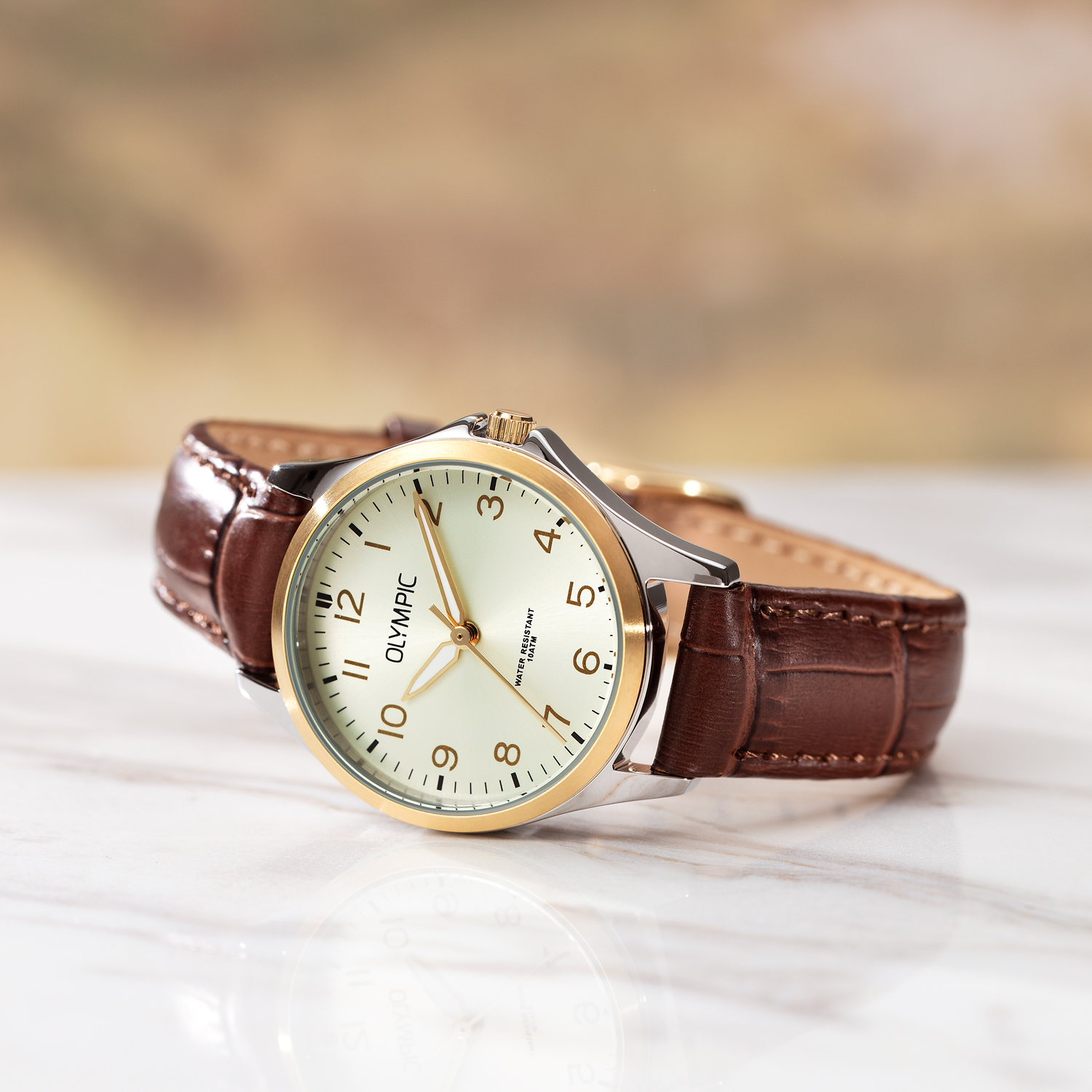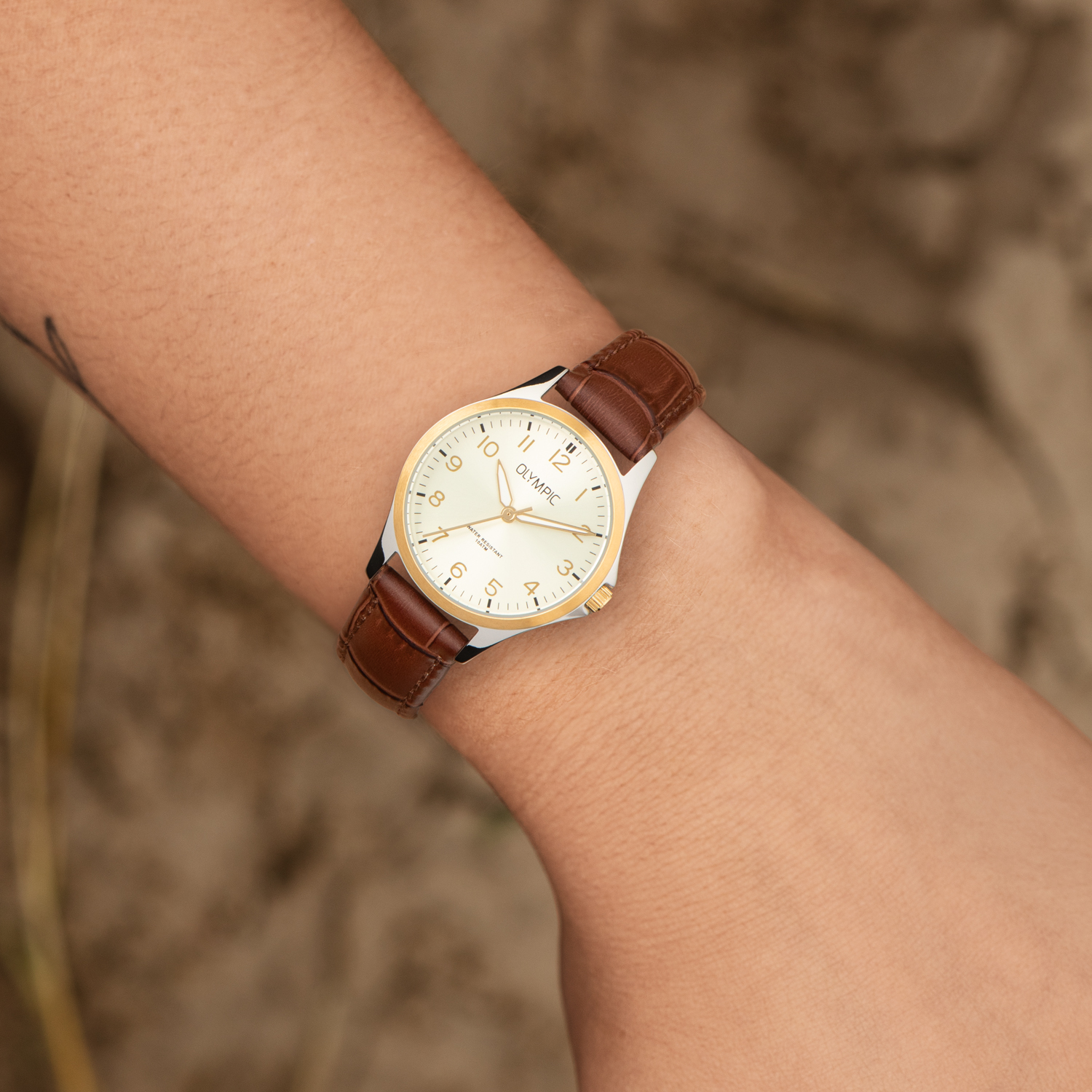 Dit unieke Olympic horloge met artikelnummer: OL72DSL048B is een dames horloge met een classic uitstraling. De stalen kast heeft een gladde goudkleurige bezel en een zilverwitte wijzerplaat. De uursaanduiding is opvallend door de Arabische cijfers en de sierlijke wijzers. Dit geeft het horloge een chique uiterlijk. Aan de stalen kast zit een bruine leren band met een gespsluiting. Het horloge heeft een mineraalglas, een doorsnee van 29mm en is 10ATM.