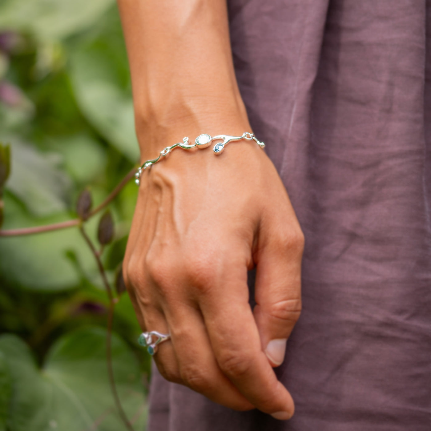 Deze prachtige sterling zilveren armband is versierd met een 7 x 5 mm blauwe kwarts, een 5 x 3 mm blauwe topaas en een 2 mm ronde blauwe topaas. De armband kan op 17 en 19 cm gedragen worden.
