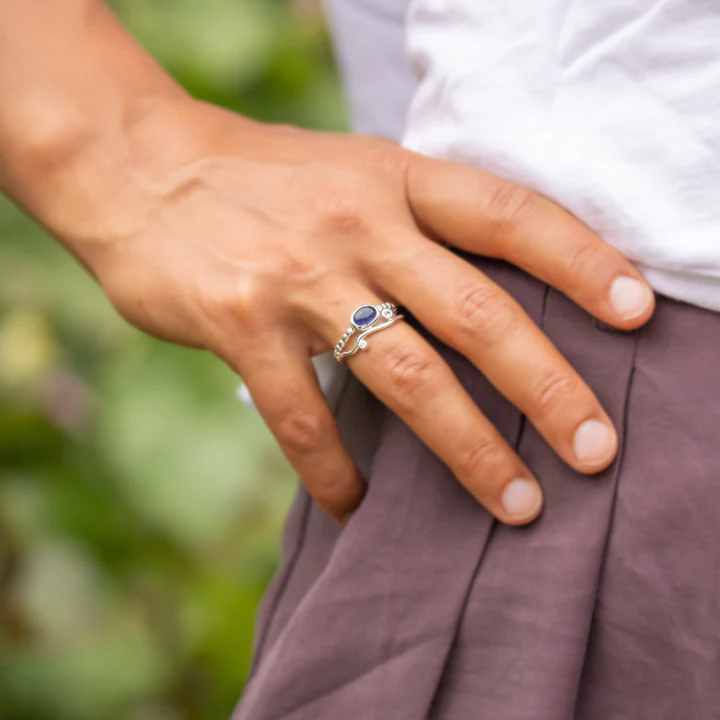 Deze sterling zilveren ring bevat een 7 x 5 mm ioliet, een 2 mm ronde blauwe topaas en een 1,5 mm zirkonia.