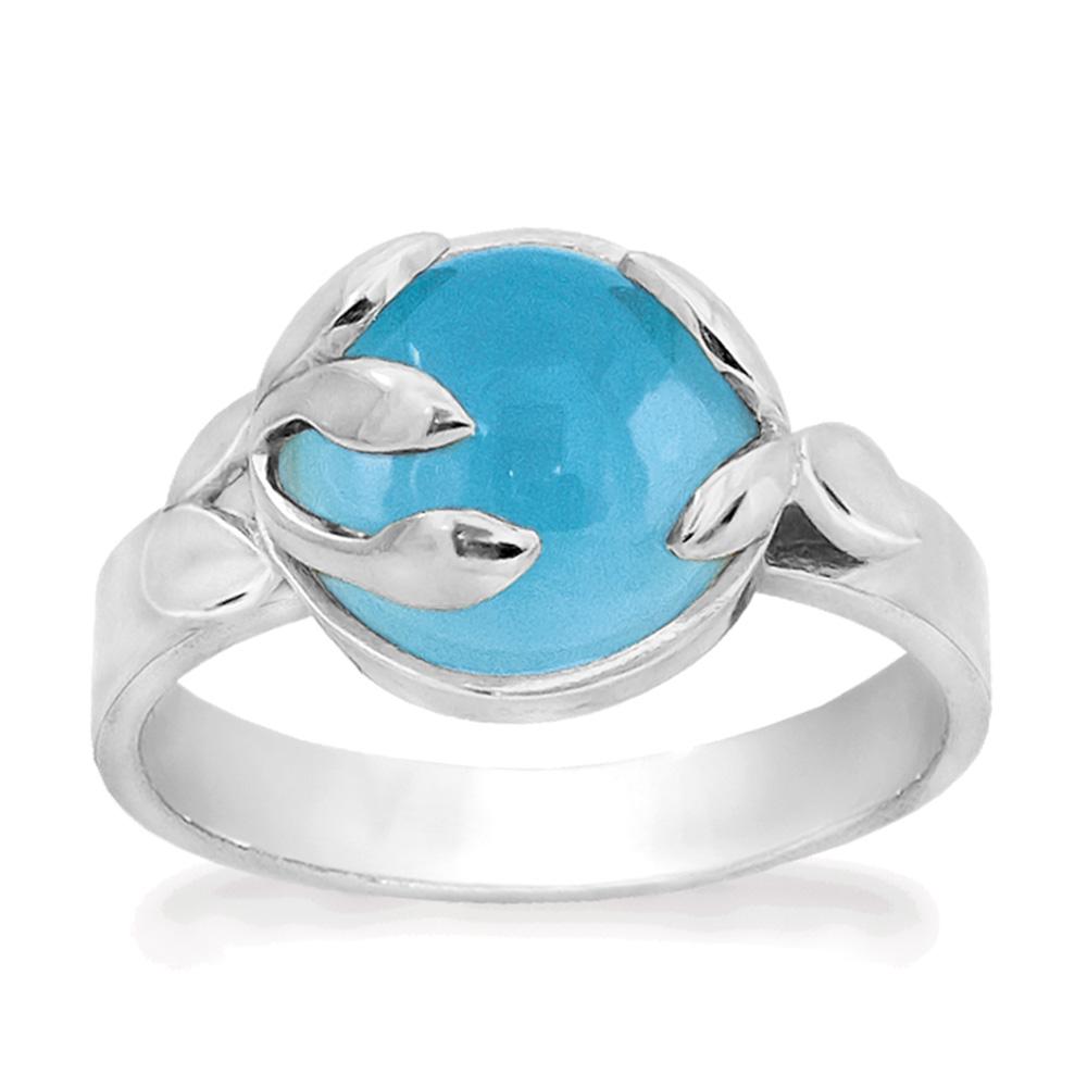 Deze sterling zilveren ring bevat een mooie 10 mm ronde blauwe chalcedoon afgewerkt met sterling zilveren blaadjes.