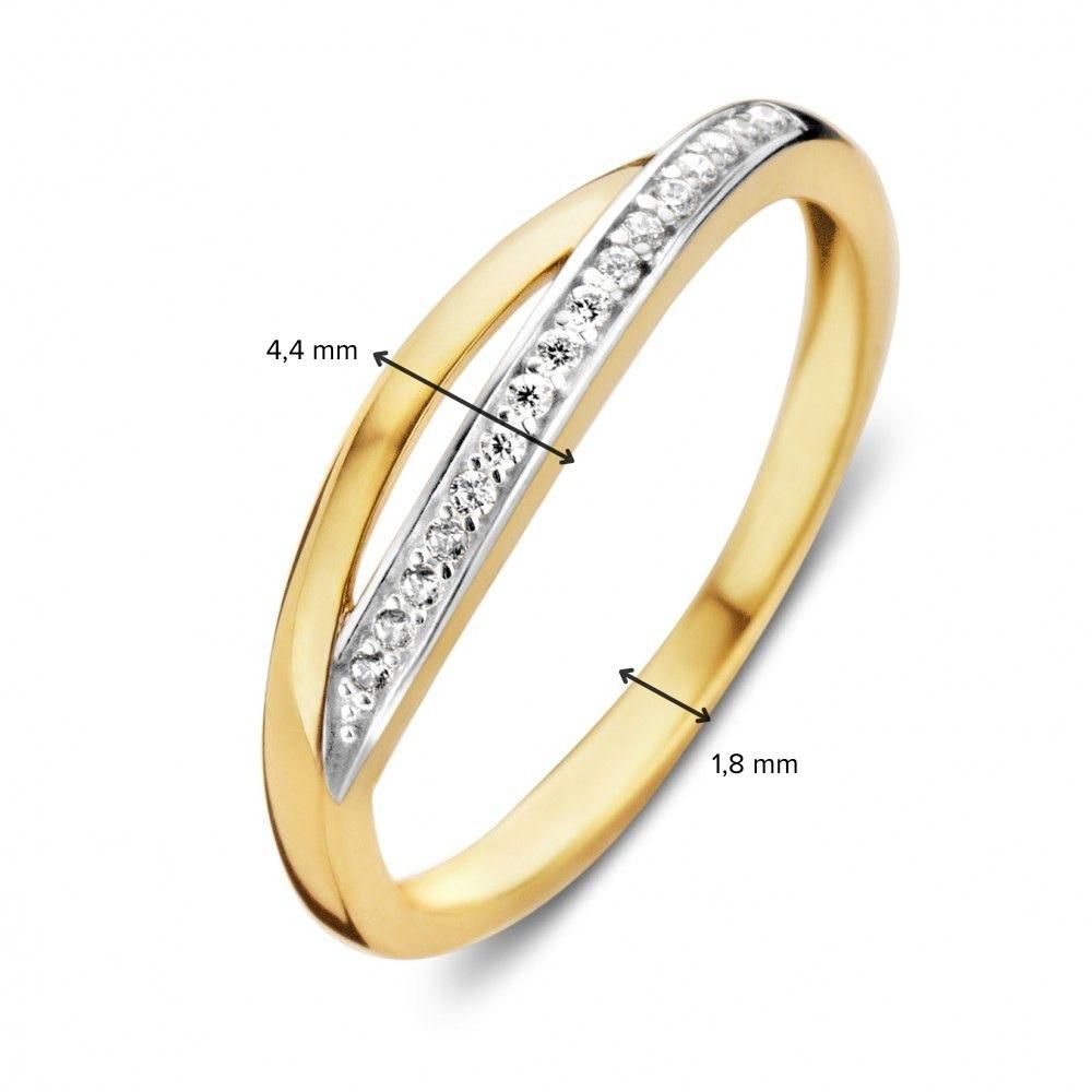 De Ring bicolor zirkonia, verfraait elke outfit met zijn verfijnde stijl. Gemaakt van geelgoud, heeft deze ring een diameter van 56 en een breedte van 4,4 mm. Het is een lichtgewicht accessoire met een glanzende gouden kleur. Perfect te dragen bij zowel formele als informele gelegenheden om een vleugje elegantie toe te voegen.