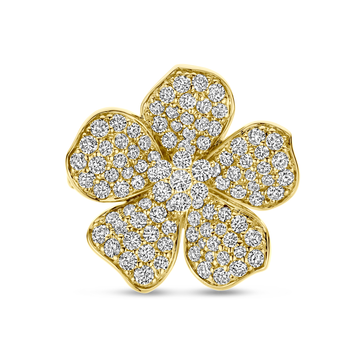 14k Geelgouden ring uitgevoerd in de vorm van een bloem met diamant. De ring heeft een breedte van 20mm. Het totale diamantgewicht is 1.50ct.