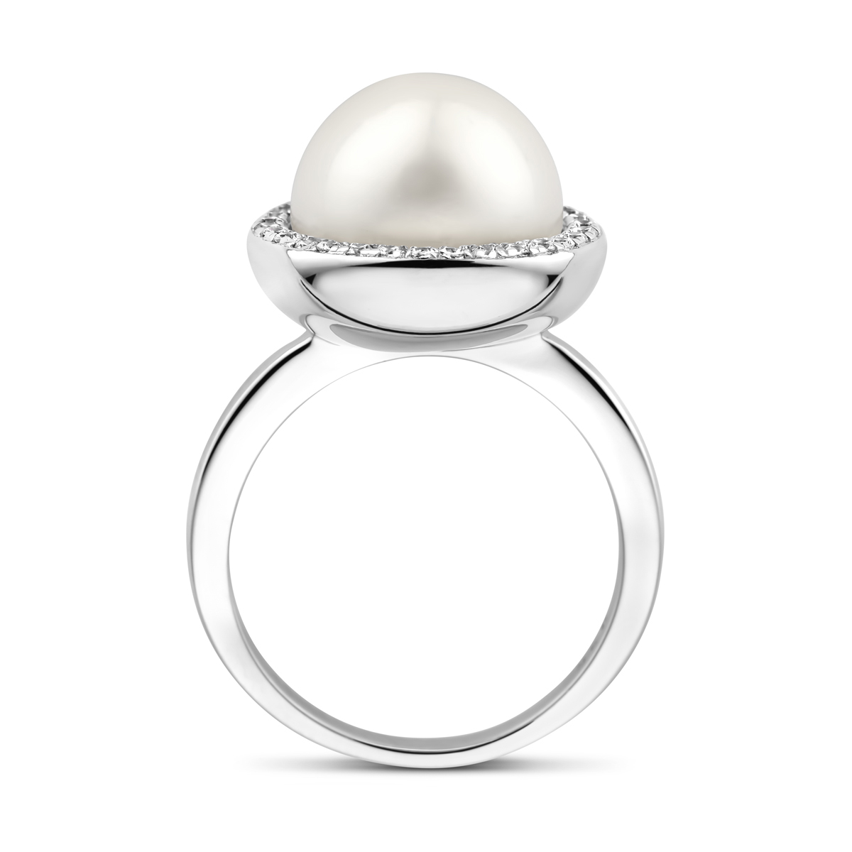 Gerhodineerd 925 zilveren ring uitgevoerd met zirkonia en een zoetwaterparel van 12mm.