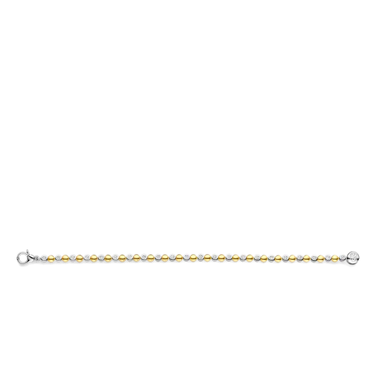Omarm de warmte van de zomer met de TI SENTO armband 23066ZY, een moderne interpretatie van tijdloos design. Vervaardigd uit 925 sterling zilver en verguld voor bescherming en langdurige glans, biedt deze prachtige armband een betoverend spel van goudkleurige halfbubbels, afgewisseld met sprankelende witte cubic zirconia gezet in zilveren zettingen. Het centrale punt is een gestileerd TI SENTO symbool, dat een vleugje ingetogen verfijning toevoegt aan dit charmante stuk. De warme gouden tinten roepen de gloed van een zomerse zonsondergang op, wat een armband creëert dat zowel elegant als moeiteloos chic is. Zorgvuldig vervaardigd voor de gevoelige huid, zorgt deze nikkelvrije en hypoallergene armband voor langdurig comfort en kwaliteit.