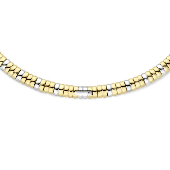 Laat je omringen door sculpturale schittering met dit TI SENTO vergulde collier 34100ZY. Vervaardigd uit hoogwaardig 925 sterling zilver toont dit pronkstuk een vloeiende reeks gedurfde schakels die afwisselen tussen stralende goudkleurige vergulding en spiegelgepolijste platinakleurige tonen. Een trio van pavé gezette accenten voegt subtiele fonkeling toe en versterkt het spel van texturen en afwerkingen. Dit statement-collier straalt zelfvertrouwen en vakmanschap uit en belichaamt architectonische elegantie met een eigentijdse edge. Het veelzijdige ontwerp vult moeiteloos zowel gestructureerd tailoring als vloeiende avond-silhouetten aan. Alleen gedragen zorgt het voor een gedurfde highlight, gecombineerd met de bijpassende armband en ring creëert het een zorgvuldig samengestelde, krachtige look. Nikkelvrij en hypoallergeen, het biedt premium comfort en blijvende schoonheid bij elke draagbeurt.