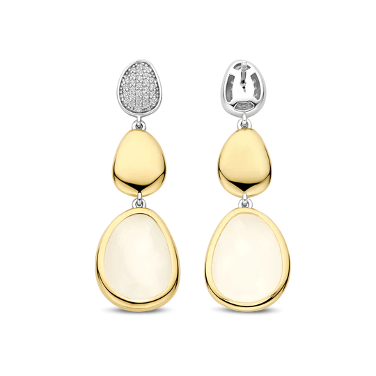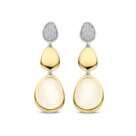 Ontdek vloeiende elegantie met deze TI SENTO goudkleurig vergulde zilveren oorbellen 78028MW. Gesmeed uit 925 sterling zilver, begint elke triple-drop met een platinakleurig vergulde schijf met pavé-gezette briljant witte cubic zirconia, gevolgd door een gepolijste goudkleurig vergulde pebble die het licht vangt met een vloeibare glans. Aan de onderzijde straalt een onregelmatige melkachtig witte steen zacht in een bijpassende goudkleurig vergulde rand, wat vrouwelijke beweging en contrast toevoegt terwijl de oorbellen meebewegen. Draag ze bij een opgestoken kapsel voor galerie-openingen, of laat ze een eenvoudige trui omtoveren tot een chique daglook. Zoals al onze TI SENTO sieraden zijn ze nikkelvrij en hypoallergeen, voor moeiteloze elegantie bij gevoelige oren.