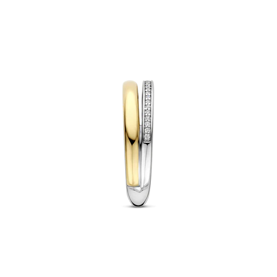 Vier moderne balans met deze TI SENTO goudkleurig vergulde zilveren ring 12392ZY. Vervaardigd uit 925 sterling zilver, bestaat dit strakke ontwerp uit twee afzonderlijke banden die samensmelten tot één sculpturaal geheel: een hoogglanzende, goudkleurig vergulde boog naast een platinakleurig vergulde boog, pavé-gezet met briljant geslepen witte cubic zirconia. Het contrast tussen zachte glans en scherpe schittering creëert een verfijnd samenspel van toon en textuur. Draag de ring solo als accent, of combineer hem met de bijpassende oorbellen voor een harmonieuze, sculpturale look. Nikkelvrij en hypoallergeen, deze ring biedt blijvende glans en moeiteloos, de hele dag durend comfort.