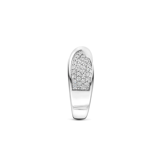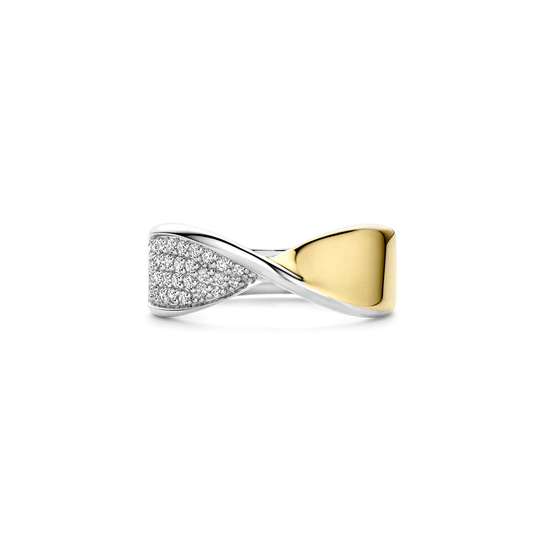 Maak een strak statement met deze TI SENTO goudkleurig vergulde zilveren ring 12393ZY. Vervaardigd uit 925 sterling zilver, wikkelt dit sculpturale design zich in een gedurfde twist om de vinger: de ene helft goudkleurig verguld, de andere helft platinakleurig verguld en pavé-gezet met briljant geslepen witte cubic zirconia. De diagonale lijn tussen glans en schittering creëert een dynamisch samenspel van contrast en beweging, perfect voor wie houdt van verfijnde impact. Draag hem solo als eyecatcher, of combineer hem met minimalistische ringen voor een moderne gelaagde look. Nikkelvrij en hypoallergeen, deze ring biedt blijvend comfort en een elegante afwerking bij elke gelegenheid.