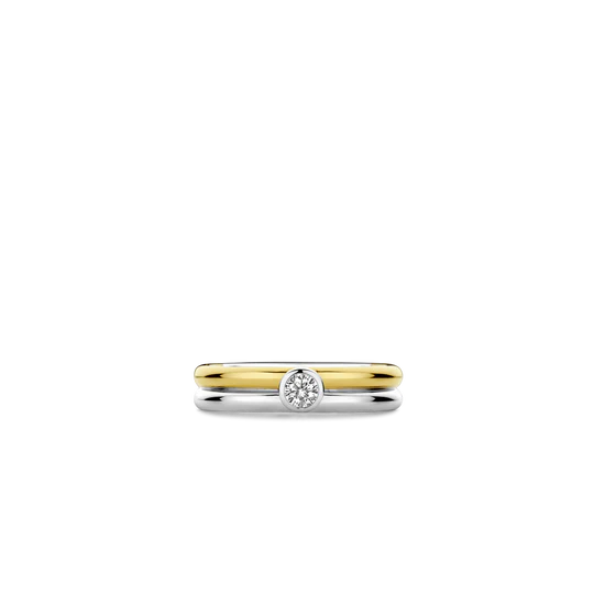 Ontdek de ultieme tijdloze elegantie van de TI SENTO gold-plated zilveren ring 12345ZY. Deze ring, vervaardigd uit 925 sterling zilver, heeft twee verfijnde ringen: één verzilverd voor een koele, eigentijdse afwerking en de andere met een stralende goudkleur voor een vleugje warmte en luxe. In het midden schittert een witte cubic zirconia steen, die een extra dosis briljantheid toevoegt. Met een perfecte mix van klassieke en moderne ontwerpen, biedt deze ring een verfijnde en veelzijdige uitstraling. Het contrast tussen zilver en de goudkleur creëert een fascinerend spel van licht en textuur. Verrijk je dagelijkse look met dit tijdloze sieraad; draag het solo voor een minimalistische statement of combineer het met andere TI SENTO ringen voor een persoonlijke touch. Zorgvuldig ontworpen voor gevoelige huiden, biedt deze nikkelvrije en hypoallergene ring langdurig comfort en kwaliteit.