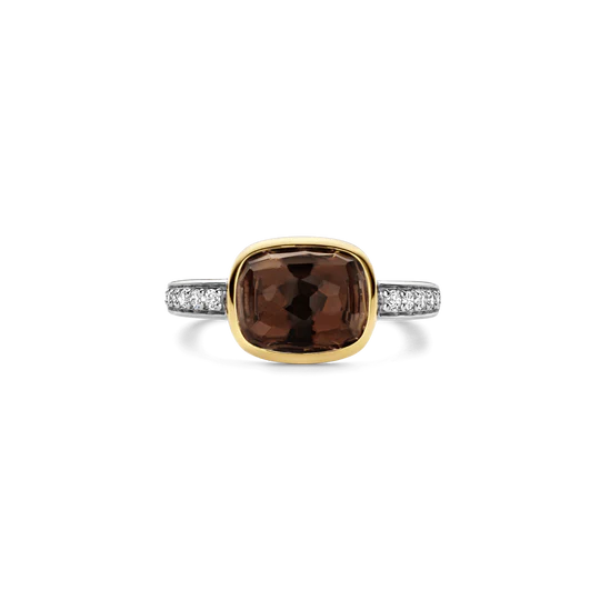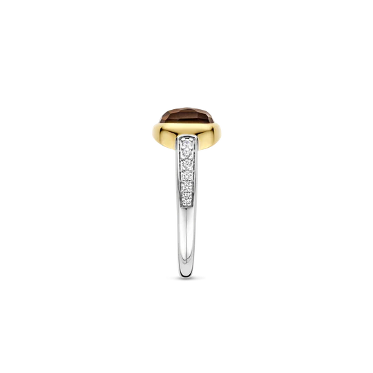 Omarm warme elegantie met deze TI SENTO vergulde ring 12398SQ. Vervaardigd uit 925 sterling zilver is dit ontwerp voorzien van een zachte kussenvormige steen in transparant smoky brown, subtiel gefacetteerd om het licht te weerkaatsen met een zachte diepte. De steen is omlijst door een gladde goudkleurige randzetting, terwijl de platinakleurig vergulde band langs de schouders is bezet met briljant geslepen witte zirconia. Het harmonieuze contrast van tint en textuur maakt dit tot een veelzijdig sieraad, verfijnd wanneer alleen gedragen of gecombineerd met complementaire ringen. Nikkelvrij en hypoallergeen, hij biedt langdurig comfort met een verfijnde afwerking.