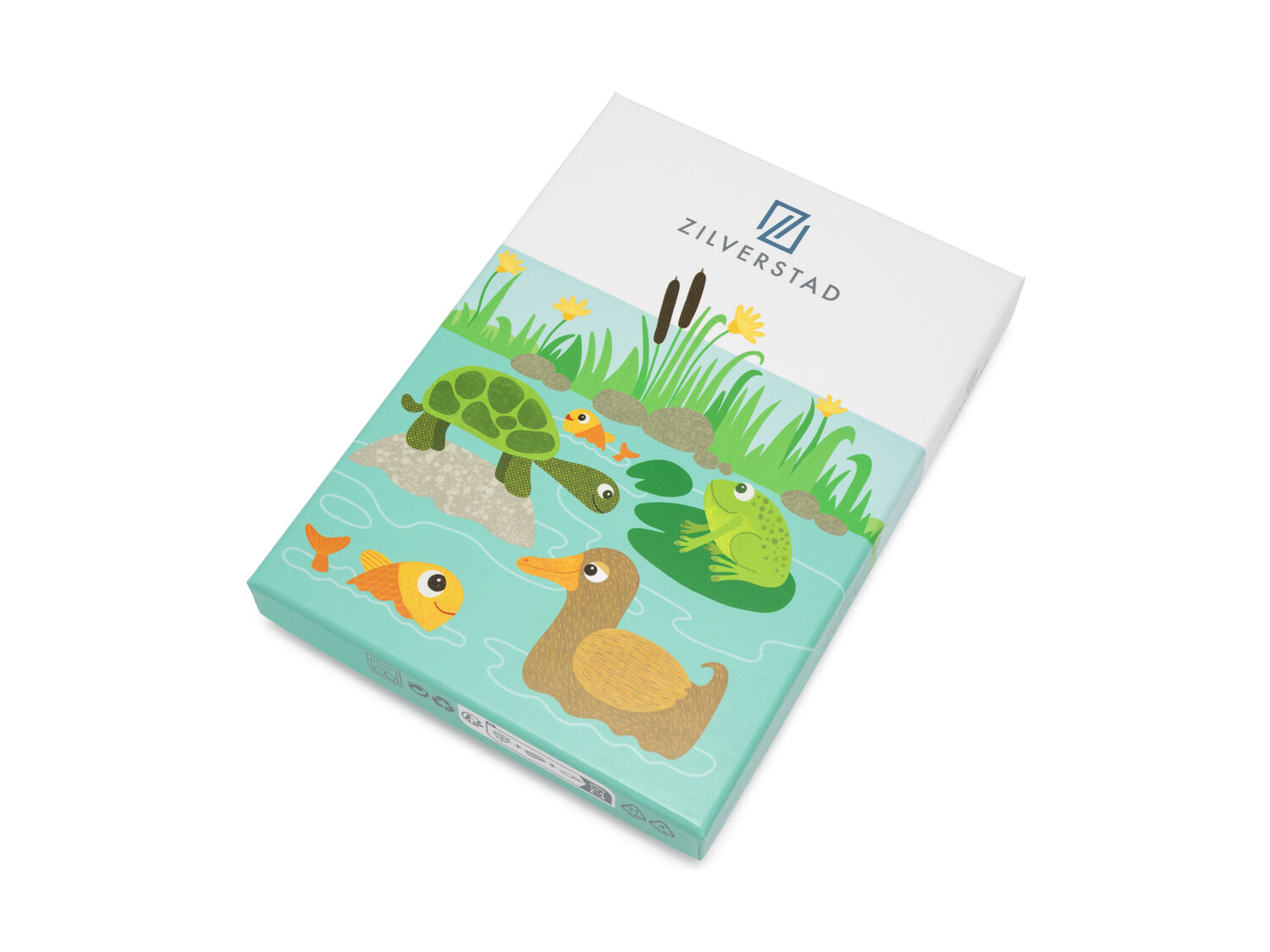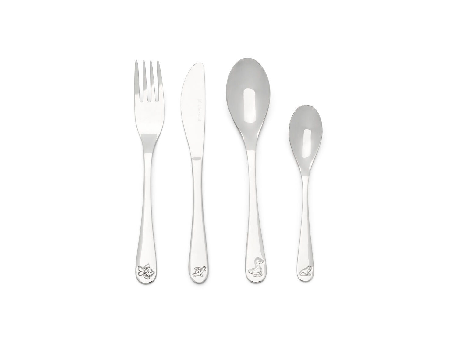 Maak kennis met de dieren die in en rond de vijver leven met dit leuke kinderbestek. Op de bestekdelen zien we een vis, een kikker, een schildpad en een eend. Het bestek is uitgevoerd in hoogwaardig 18/10 RVS dat vaatwasmachinebestendig is en wordt geleverd in een kleurrijke geschenkverpakking.